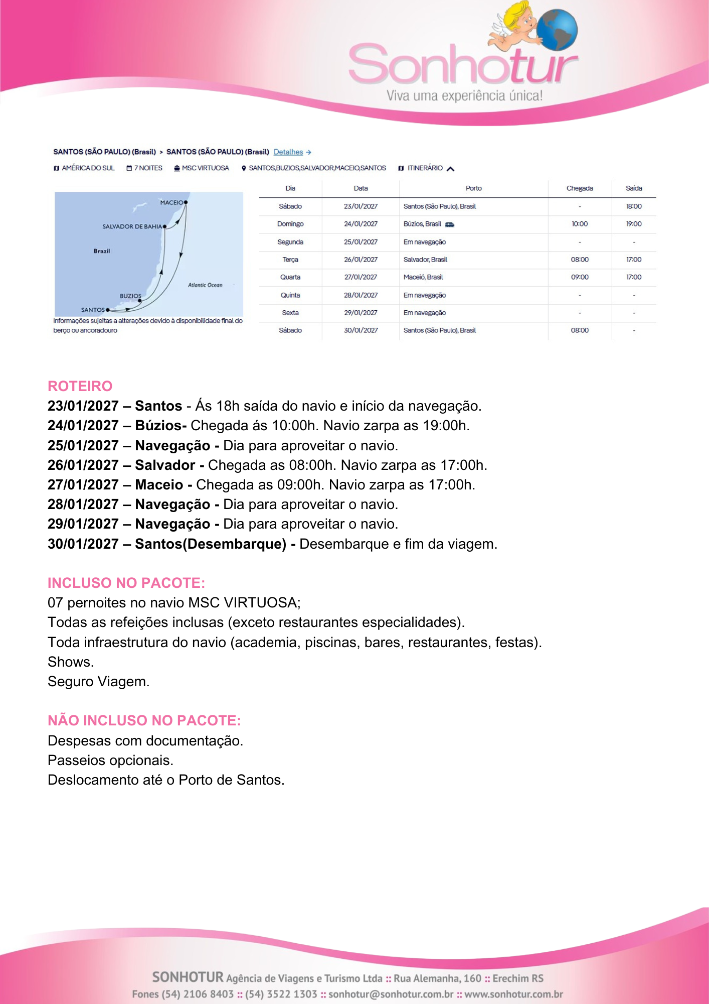 27/01/2027 – Maceio – Chegada as 09:00h. Navio zarpa as 17:00h.